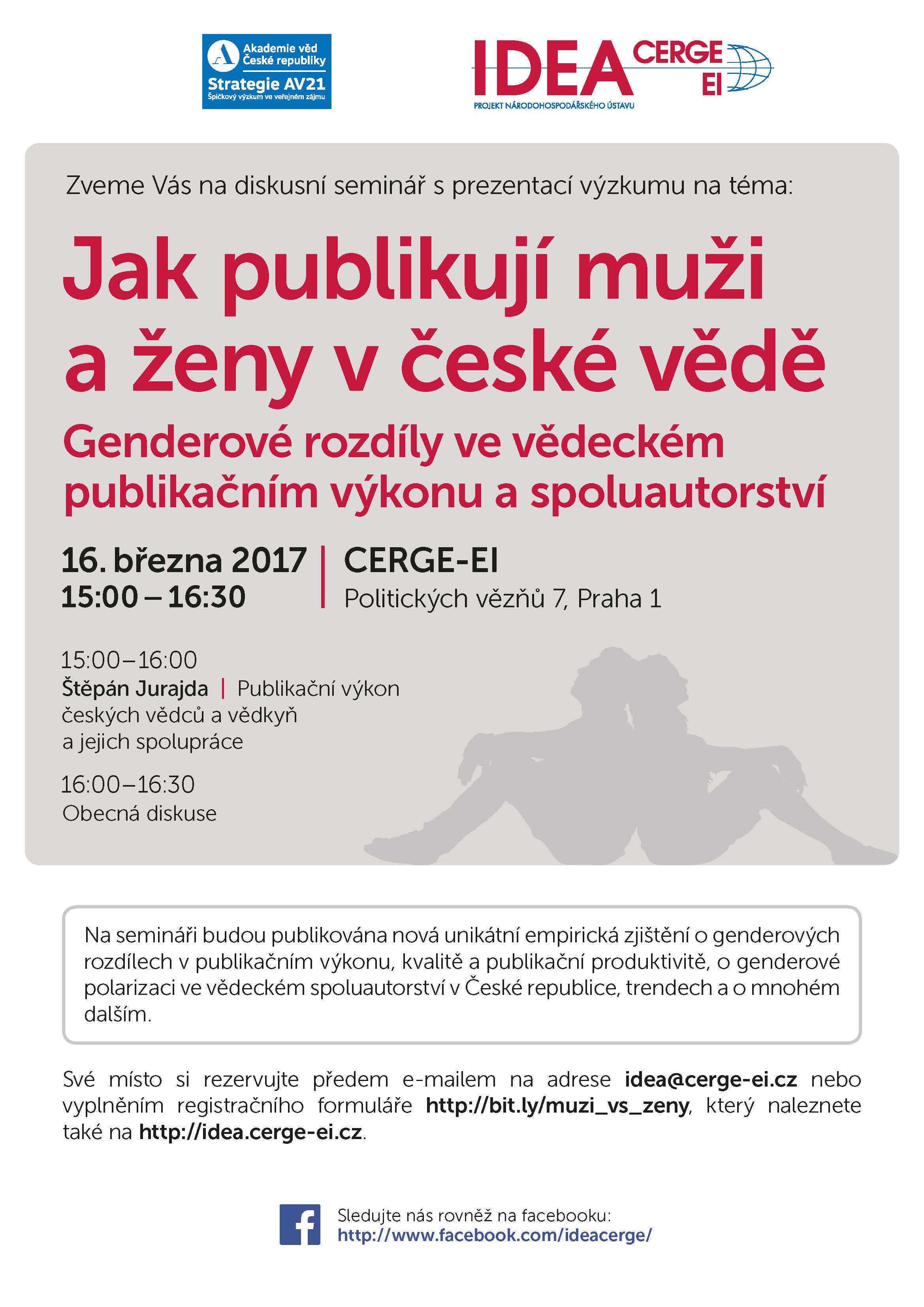 Think tank IDEA při Národohospodářském ústavu AV ČR Vás zve na diskusní seminář spojený s prezentací výsledků výzkumu na téma "Jak publikují muži a ženy v české vědě: Genderové rozdíly ve vědeckém publikačním výkonu a spoluautorství", který se koná dne 16. 3. 2017 od 15:00 hodin do 16:30 hodin v prostorách CERGE-EI, Politických vězňů 7, Praha 1. Podrobnější pozvánku naleznete po rozkliknutí článku.