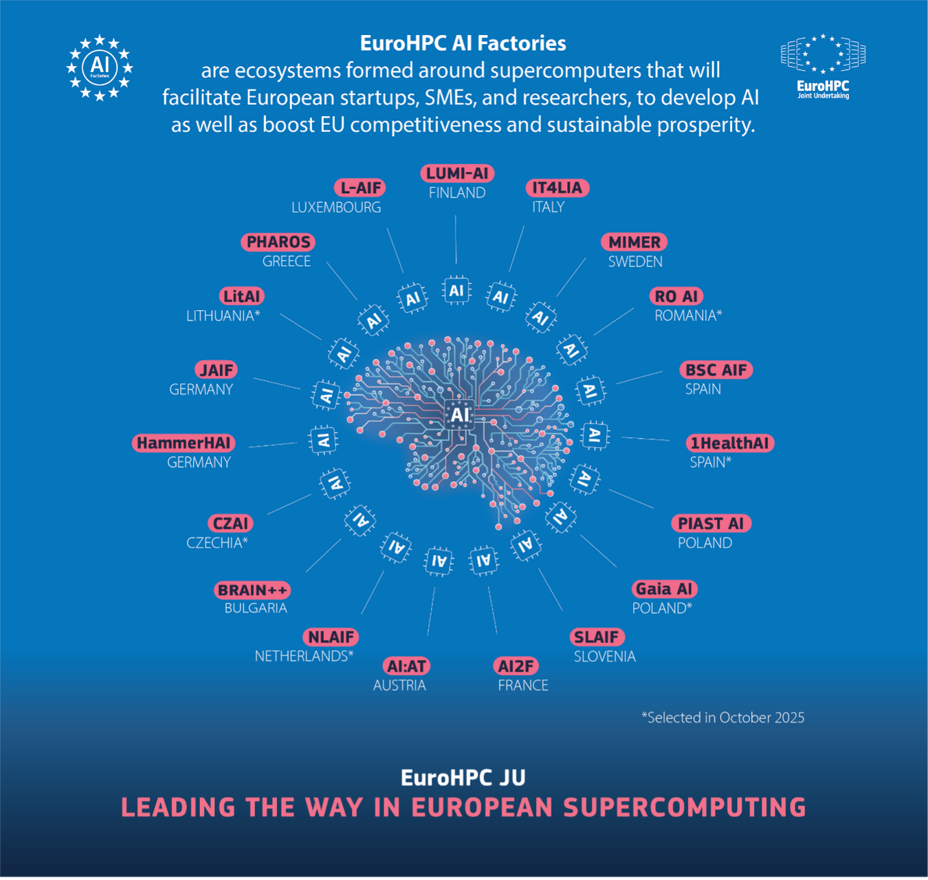 Výzvy na AI Factories byly ve třech kolech vypsány společným evropským podnikem EuroHPC. EuroHPC JU je právní a finanční subjekt, který sdružuje Evropskou unii, zúčastněné státy a soukromé subjekty s cílem koordinovat úsilí a spojovat zdroje s ambicí učinit Evropu světovým lídrem v oblasti superpočítačů, kvantových počítačů a umělé inteligence. Šest nových AI Factories se připojí k 13 již dříve vybraným a vytvoří tak propojenou síť AI center, která budou připravena podporovat inovace v oblasti AI v celé Evropě. Každá AI Factory bude fungovat jako jednotné kontaktní místo, které startupům, malým a středním podnikům, průmyslu, veřejným organizacím a výzkumným pracovníkům v oblasti AI nabídne komplexní podporu při nasazování AI nástrojů, správě a zpracování datových sad, přístup k výpočetním prostředkům optimalizovaným pro AI, poskytování školení a transferu technické znalosti jakož i podporu nových talentů.