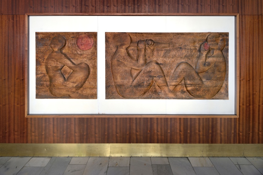 blok E – Láska, 97 x 180 cm a Rodina 97 x 90 cm; dřevo bez moření; značeno 1) na pravé desce v levém horním rohu ve vyrytém kruhu JW, 2) na levé desce dole uprostřed vyryto vrapováním ve struktuře reliéfu JW