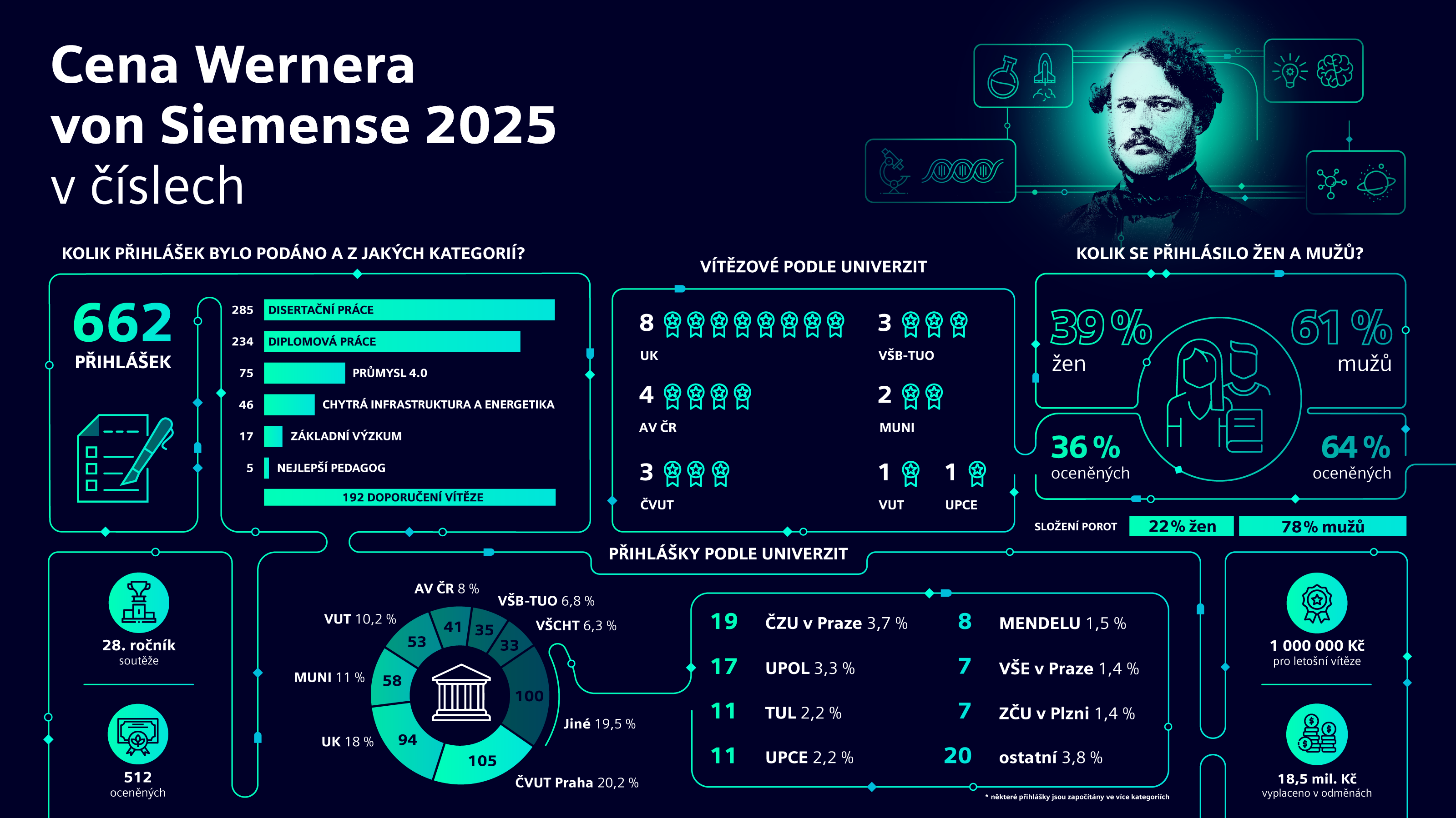 Český Siemens udělil Ceny Wernera von Siemense za rok 2025 nejlepším studentům, mladým vědcům a pedagogům. Vítězné práce z oblastí technických a přírodovědných oborů vybraly odborné poroty v kategoriích: Nejlepší výsledek základního výzkumu, Nejlepší diplomová práce, Nejlepší disertační práce a Nejlepší pedagogický pracovník. Spolu se studenty a studentkami získávají odměnu i vedoucí a školitelé jejich prací. Ocenění byla udělena za vynikající kvalitu ženské vědecké práce a za absolventské práce zabývající se tématy konceptu Průmysl 4.0 a chytrou infrastrukturou a energetikou.